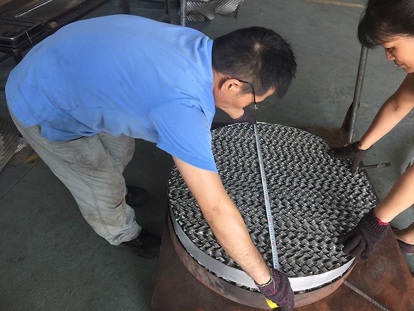 2017年7月間,氣溫高達(dá)40℃以上,在如此惡劣環(huán)境的情況下,我廠質(zhì)量檢測(cè)人員在加工工人的配合下頂著酷暑對(duì)我廠加工產(chǎn)進(jìn)行檢測(cè)。 我司規(guī)定,自動(dòng)加工產(chǎn)品是對(duì)產(chǎn)品質(zhì)量進(jìn)行抽檢,半自動(dòng)加工產(chǎn)品以及手工加工產(chǎn)品質(zhì)則需對(duì)產(chǎn)品質(zhì)量一一進(jìn)行檢測(cè)。 SM250型直徑為810的孔板波紋填料為半自動(dòng)手工加工產(chǎn)品,質(zhì)量檢測(cè)人員核實(shí)孔板設(shè)計(jì)數(shù)據(jù),檢測(cè)孔板波紋填料的實(shí)際直徑。對(duì)技術(shù)人員提出保證峰高估算距離合理性的建議,對(duì)加工工人提出保證每片孔板長度的精確度達(dá)到±0.5mm。以保證產(chǎn)品符合合同要求,保證滿足客戶所需,保證產(chǎn)品質(zhì)量100%合格。